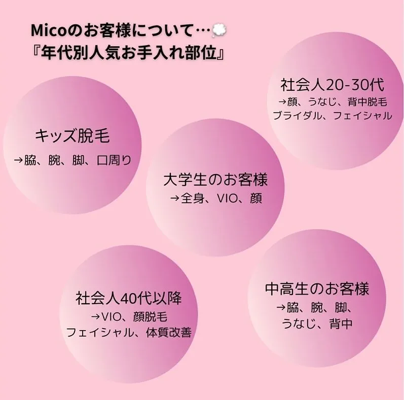 Micoではたくさんのお客様がキレイになって笑顔になりたいと、いろいろな年齢層のお客様がご来店くださっています✨