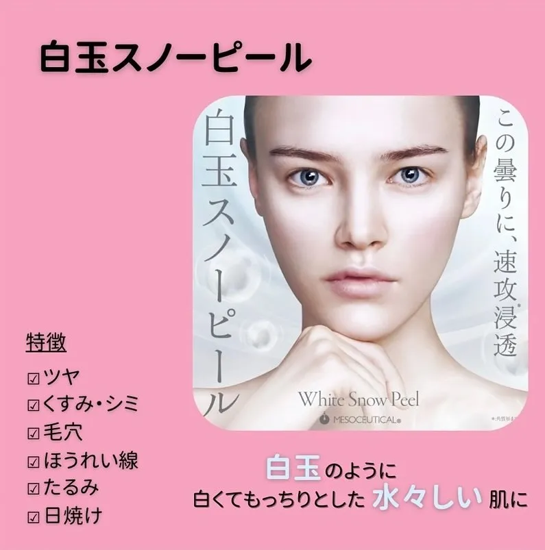 白玉スノーピールは、効果の高い成分がが詰まった製品を使用しているため、さまざまな悩みのあるお客様に向けたアプローチの仕方で美肌に近づくことができます!!
